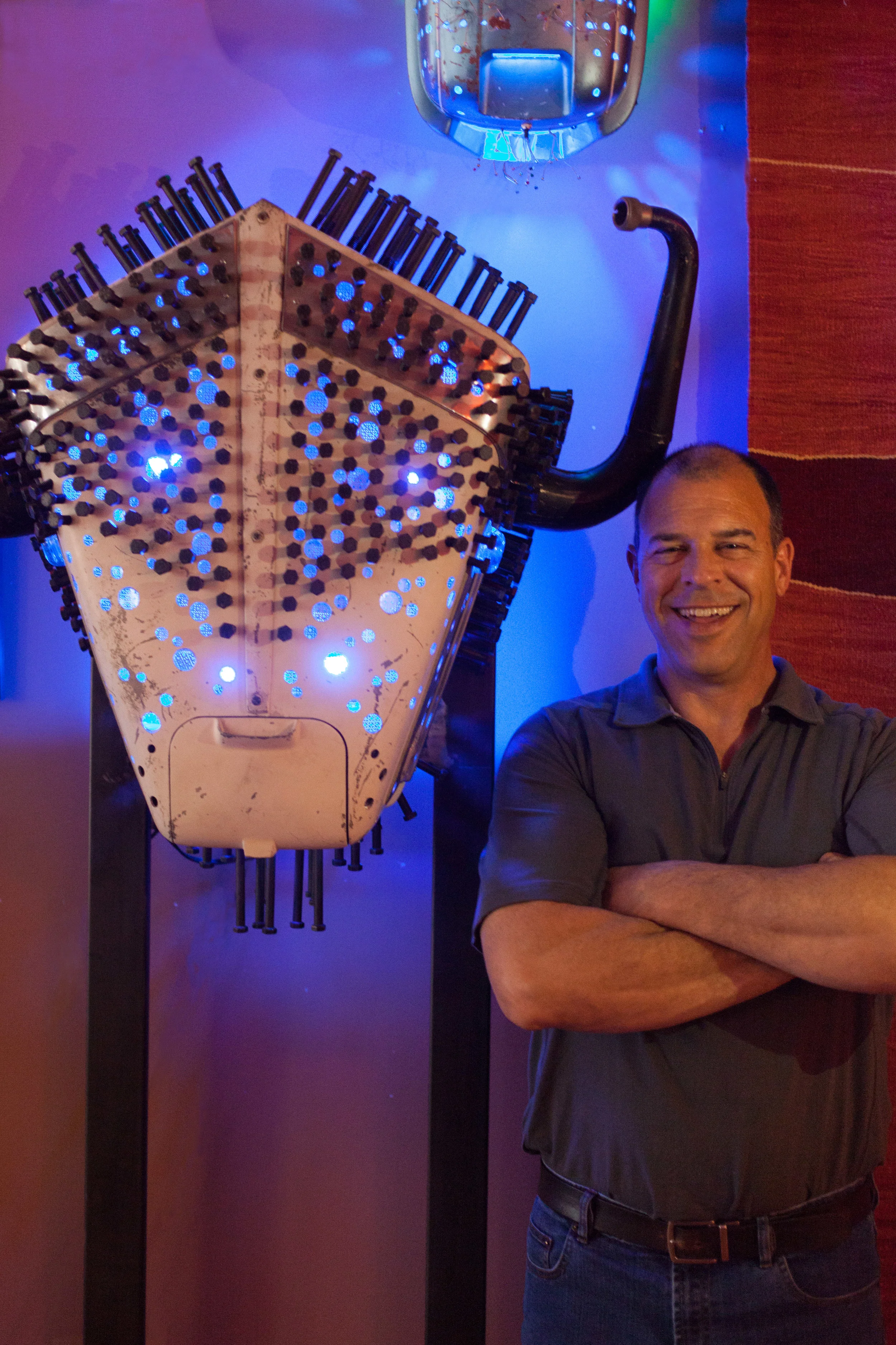 Almost all of my pieces are creatures of one sort or another. Even the machines have personalities. In this respect, I would say Dr. Seuss has been a major influence on my work. I, like every other child in the 1960s, grew up reveling in how even the trees in his illustrations seemed to have distinctly-human characteristics. I often say my work doesn’t have any hidden agenda, but perhaps it does. I do strive to reignite that sense of childlike wonder in my viewers, and show that the world around us is alive in ways we fail to see. I employ electricity in virtually every piece I create. It’s almost a “Frankenstein” thing, that light. Flipping the switch on my pieces gives life to an inanimate object, and, I hope, also transfers some life back to the person who flips the switch.